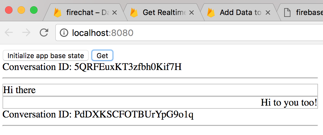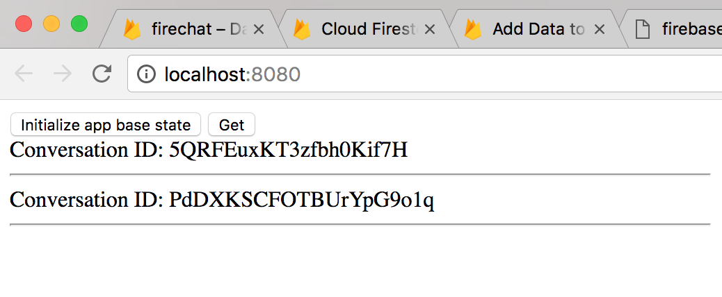 Firstly, refresh the Vue application and hit get to query Firestore for the conversations. Check the console. You should see Source: Server printed twice. onSnapshot() triggers immediately, returning the current state of the document. It also will trigger every time the document changes.