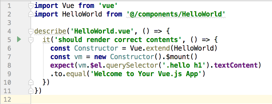 Finally, we’re ready to look at our assertion. Here, we’re expecting the text inside of .hello h1 to equal “Welcome to Your Vue.js App.” Is that true? Well, if you’ve run your tests already, you know they pass. So, let’s check out HelloWorld.vue to see how the code is set up.