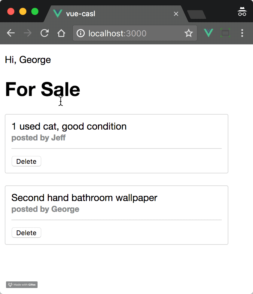 We then use CASL to check if the current user has permission for this operation via this.$can('delete', post). If they do have permission, we can take some action. If not, an error message “Only the owner of a post can delete it!” could be shown.